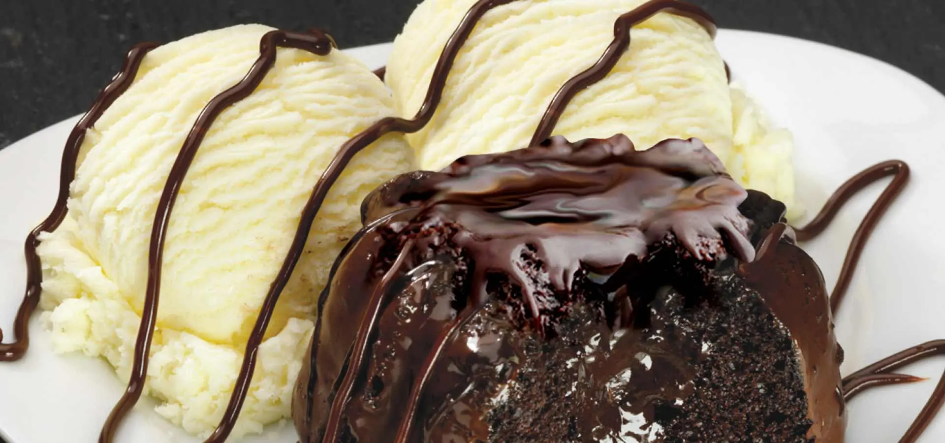 Chocolate cake with a hot fudge center, alongside two scoops of ice cream drizzled with chocolate sauce. 810 cal.