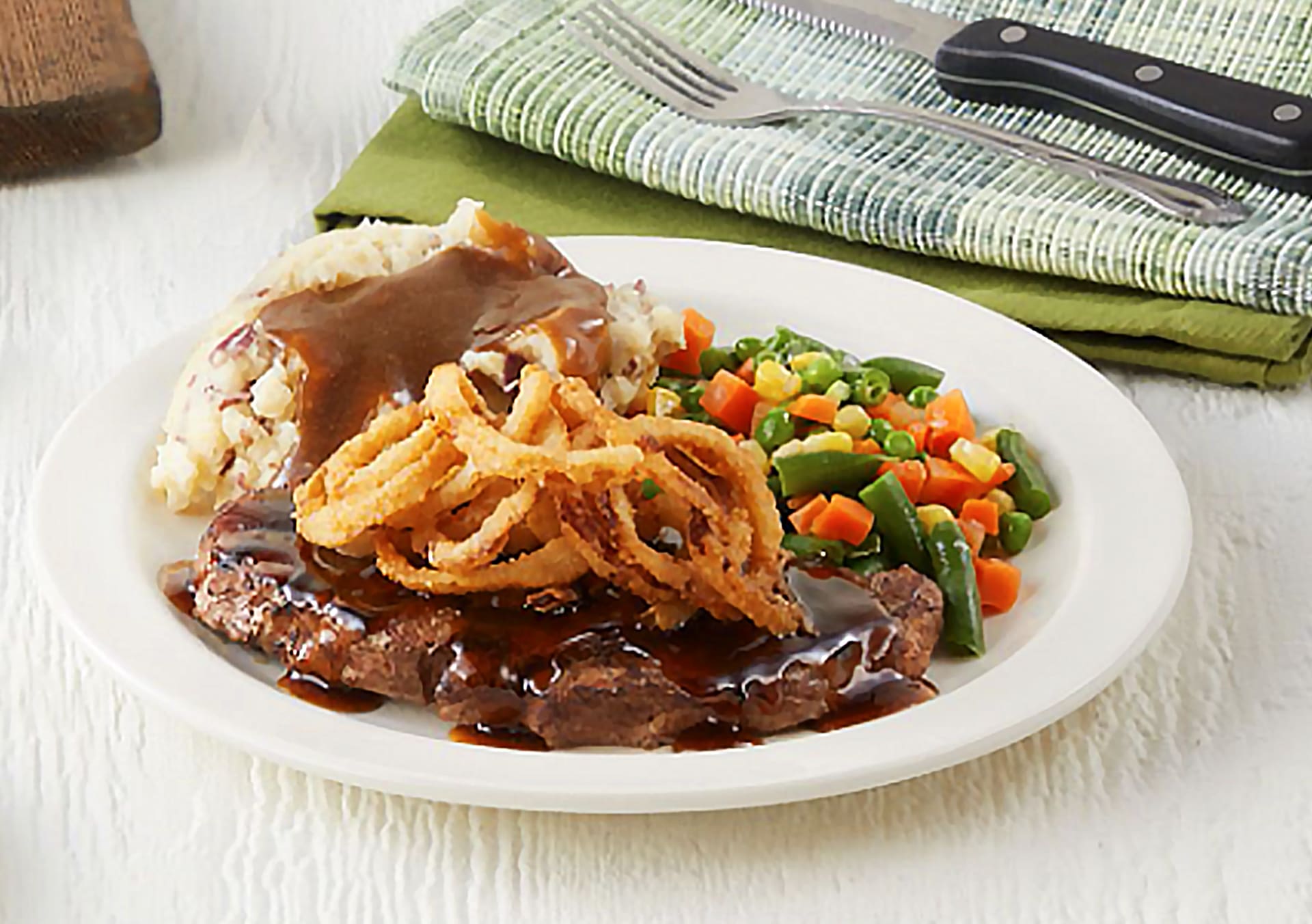 Select beef steak, lightly breaded and seasoned, fried until golden, and ladled with our Country Gravy. 720-1060 cal.